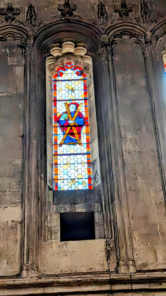 Saint Andrew was crucified on a cross and is thus often depicted.