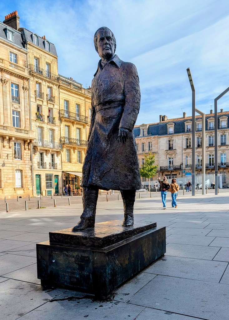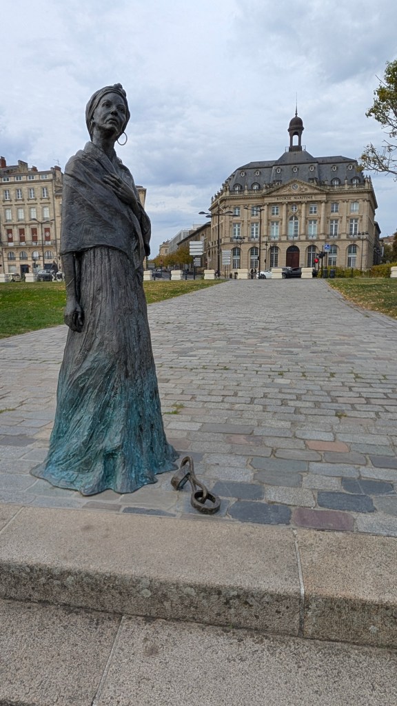 In front of which stands a bronze statue which depicts Modeste Testas (also known as Marthe Adélaïde Modeste Testas), an enslaved African woman who was born in East Africa and brought to Bordeaux in the late 18th century. The monument serves as a memorial to the city’s historical involvement in the slave trade. The statue represents the resilience of enslaved people, with broken shackles depicted at her feet. It was sculpted by artist Kafack F. and inaugurated in 2019.