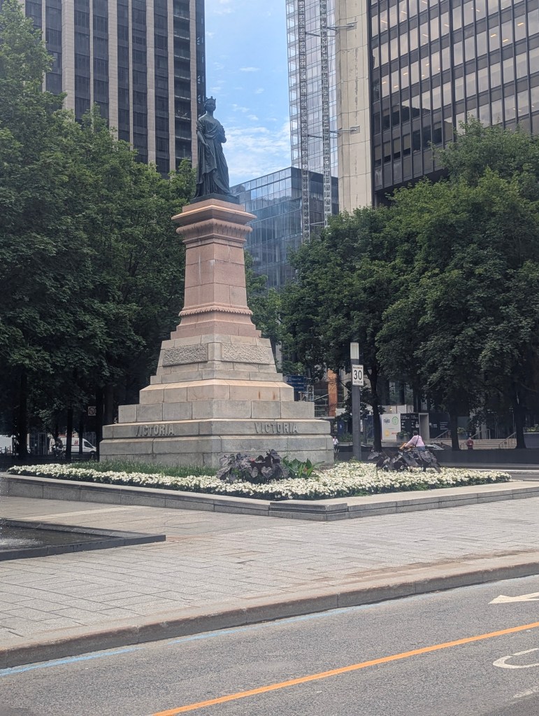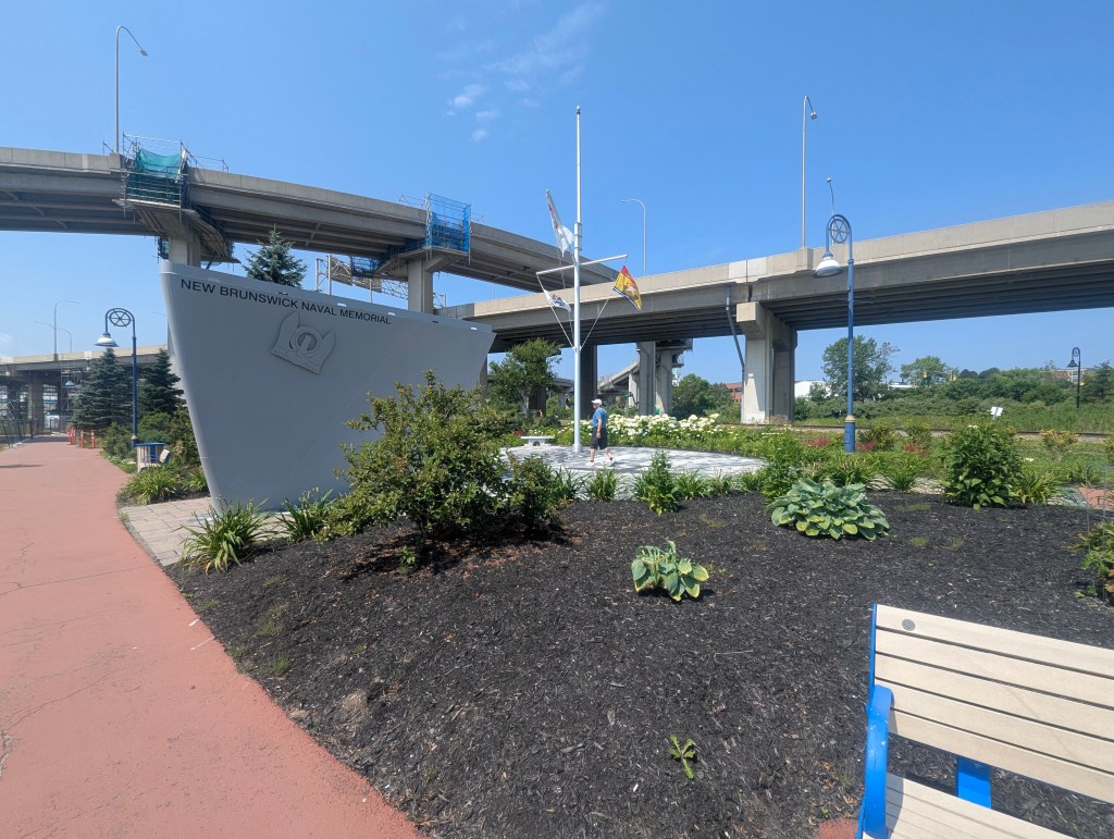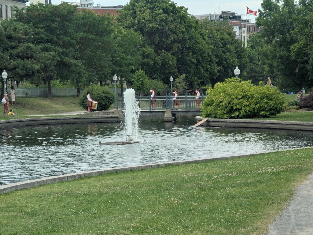and into Confederation Park, where we met our guide Jonah. He started with the background history of PEI: the Mi’Kmaq arrived thousands of years ago via ice bridges. The first caucasians arrived in 1594. The French established the first settlement in 1713. Originally the island was named Saint John by the French, but when the English took over it was renamed in 1799 to honor Prince Edward, Duke of Kent and Strathearn, the fourth son of King George III and the father of Queen Victoria. He was so honored due to his service as commander of British forces in the Maritimes and his interest in the colony’s development, even though he never visited the island. In 1864 the growing city held a conference of provinces: New Brunswick, Novas Scotia, and Province of Canada (at the time included both Ontario and Quebec) to negotiate for a larger single confederation. (PEI was included in the conferences but joined the Confederation later, in 1873.) On the day the delegates were due to arrive there was a circus in Charlottetown. There had not been a circus in over 20 years; it was much more interesting to the majority of the population. There was no one working at the public wharf at the foot of Great George Street when the Canadian delegates arrived on the steamship SS Victoria, so Prince Edward Island representative William Henry Pope (1825-1879) had to handle receptions by himself, including rowing out to greet the new arrivals. The statue below, on Confederation Landing, represents that greeting. The brick walkway appears undulating to represent the waves.