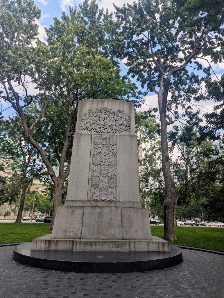 The monument shown is the Halifax Grand Parade Cenotaph unveiled on July 1, 1929, to commemorate the men and women of Halifax who died in the First World War. It was later updated to include the years of the Second World War and the Korean War.