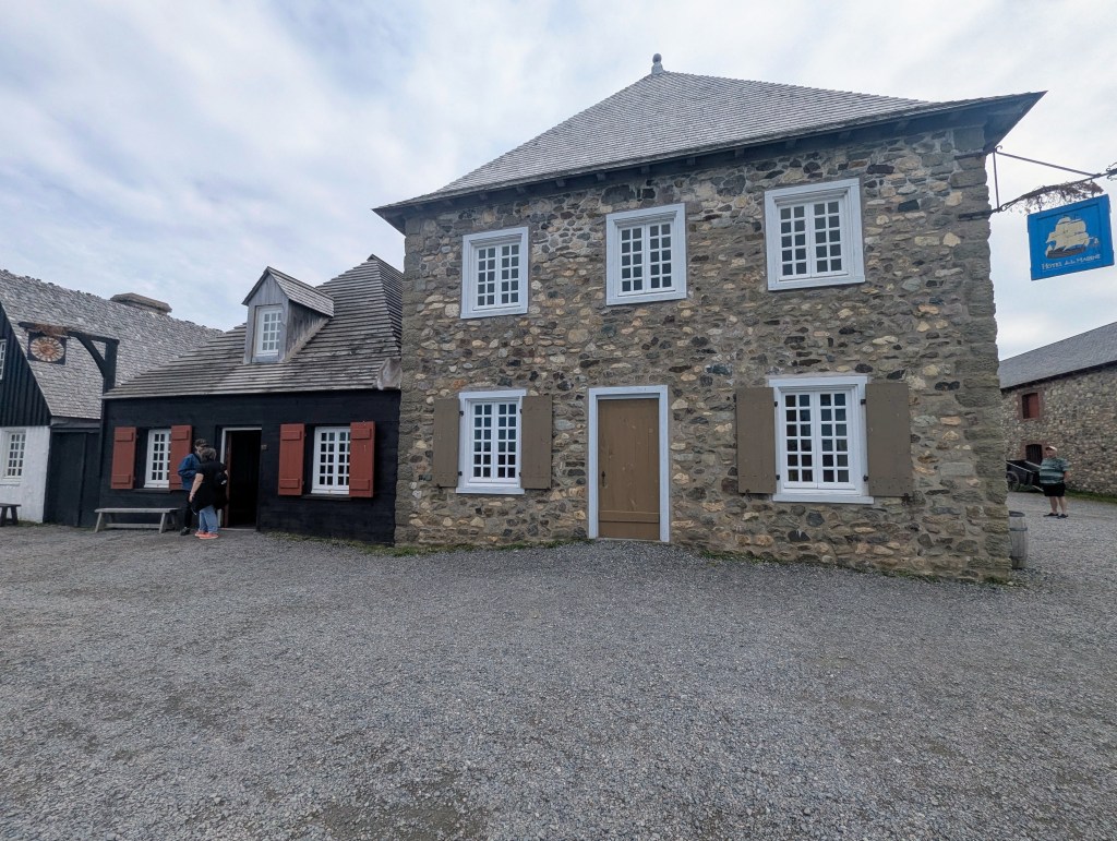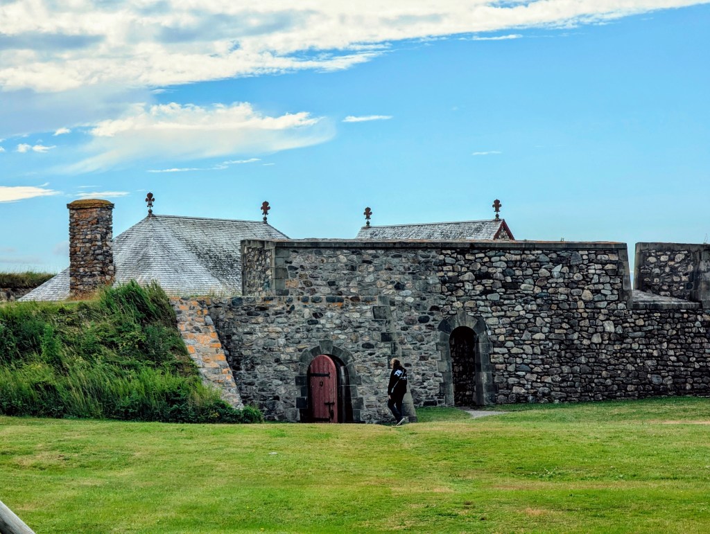 before enjoying our “usual” lunch for the next few weeks: seafood chowder and lobster rolls. After fortifying ourselves with a hearty meal, we headed to the Fortress of Louisbourg, a National Historic Site of Canada. Much to our surprise we learned that all national sites, parks, monuments, etc. were free for the summer of 2025. It was later explained to us, by family members living in Canada, that this was one of the many ways Canada’s government has pushed back against some of Trump’s tariffs and threats; it was an incentive to keep Canadian tourists in Canada and not in the US. We boarded a bus and were driven to the fort.