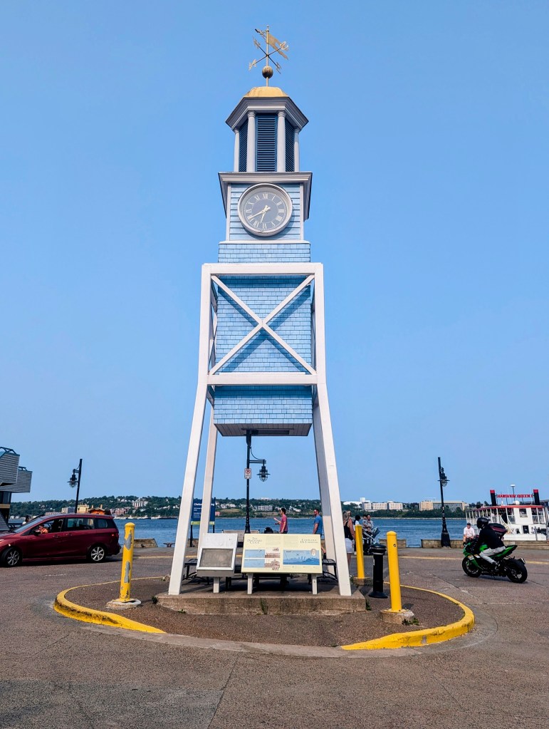 and continued walking. About central is the Dockyard Clock. Originally installed in 1772 in the domed cupola of the Hauser Stores, which were part of the original Halifax Naval Dockyard, it is the last remaining architectural feature of the original Naval Dockyard. It is one of the oldest turret clocks in Canada. The clock has been relocated three times and its current location is at Chebucto Landing.
