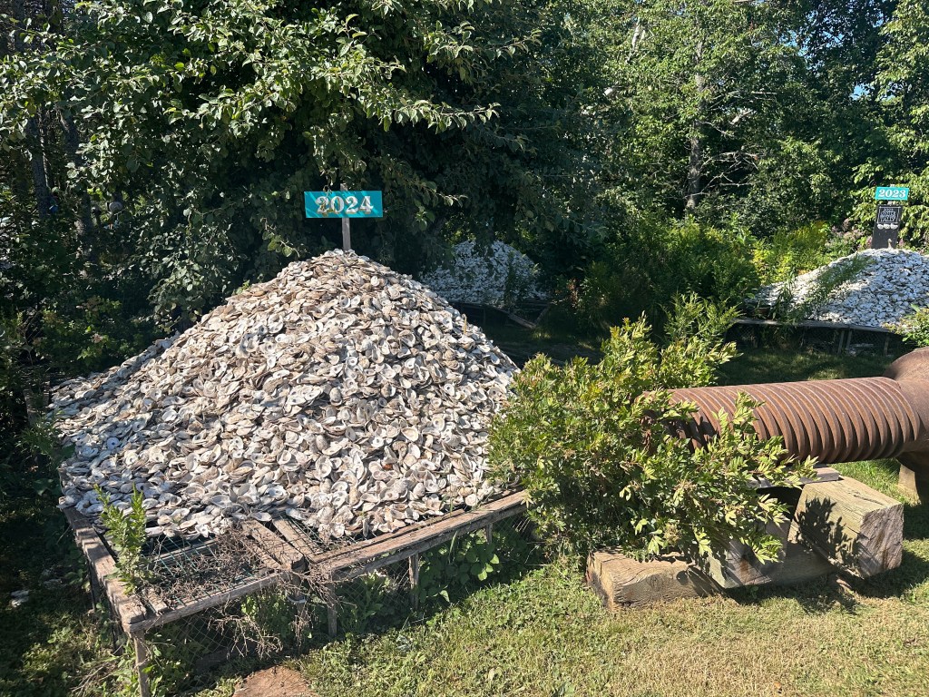 In the back of the woods are huge piles of oyster shells labeled with the year in which they were consumed.