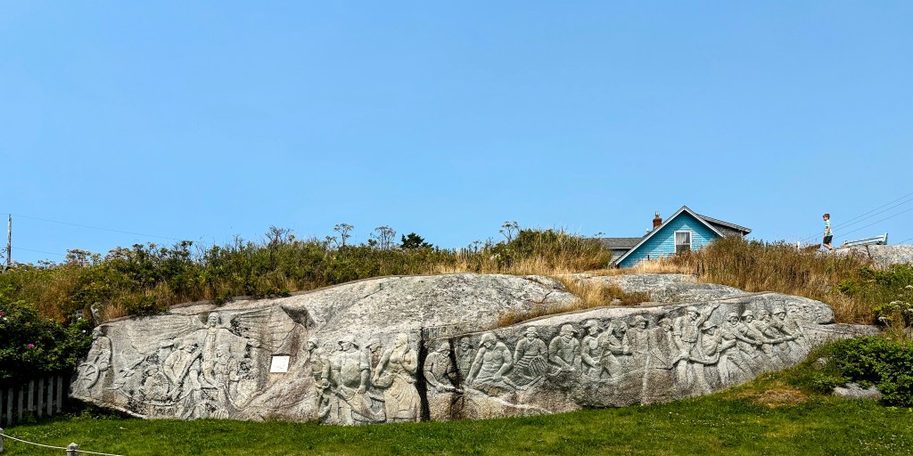 William Edward deGarthe (1907–1983) was a Finnish painter and sculptor who lived for much of his life in Peggy’s Cove. In the late 1970s, deGarthe began a ten-year project to sculpt a “lasting monument to Nova Scotia fishermen” on a 100 ft granite outcropping behind his Peggy’s Cove Home. In 1976 deGarthe invited one of his students, J. Rene Barrette to help him with the sculpture. They worked together for 5 years. The project was about 80-per cent complete when the artist died in 1983.